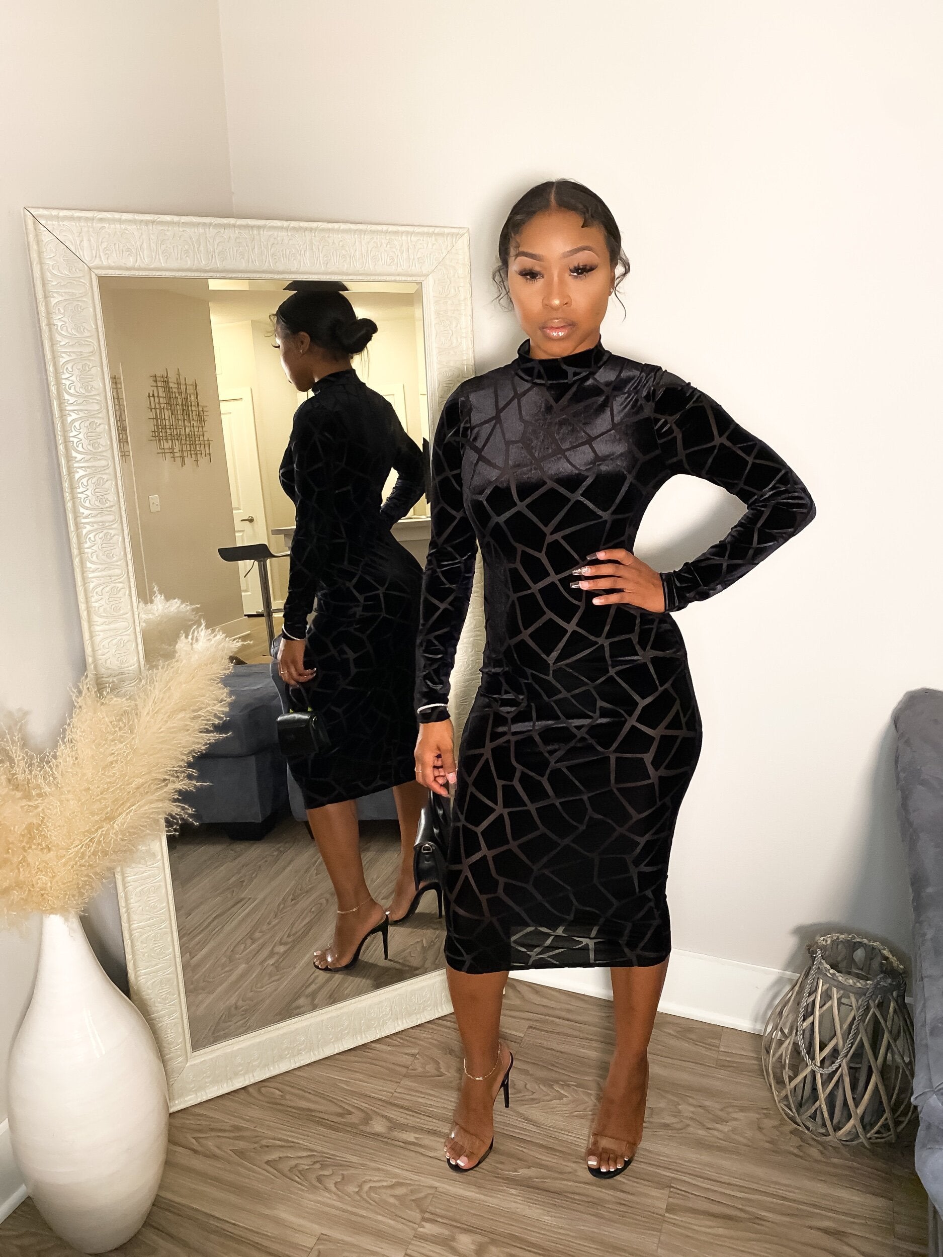 Velvet midi dress, with suede checkered patterns. Slightly sheer but not as sheer as the original Velvet Bonita dress.